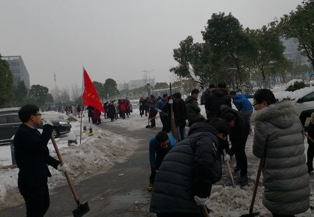 1月29日上午,園區(qū)內(nèi)近300人參加鏟雪除冰保暢通活動(dòng)。我公司黨委書記夏峰同志帶領(lǐng)公司五十多名員工,對公司大樓前環(huán)島及周邊道路進(jìn)行掃雪除冰。由于天氣寒冷,路面全部結(jié)凍,給清掃工作帶來極大困難。大家分工明確,齊心合力,有的用鐵鍬破冰,有的用掃帚清掃積雪,干得熱火朝天。